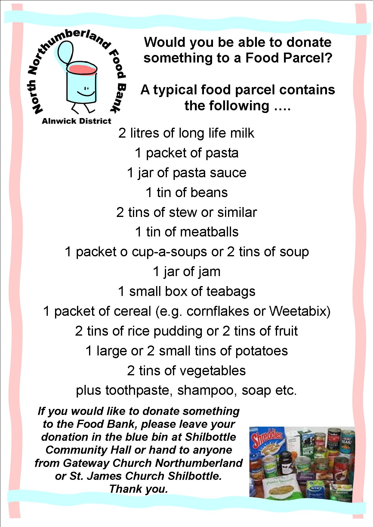 To drop food off in Shilbottle, please contact or go along to Gateway Church Northumberland, St. James Parish Church or Shilbottle Community Hall.